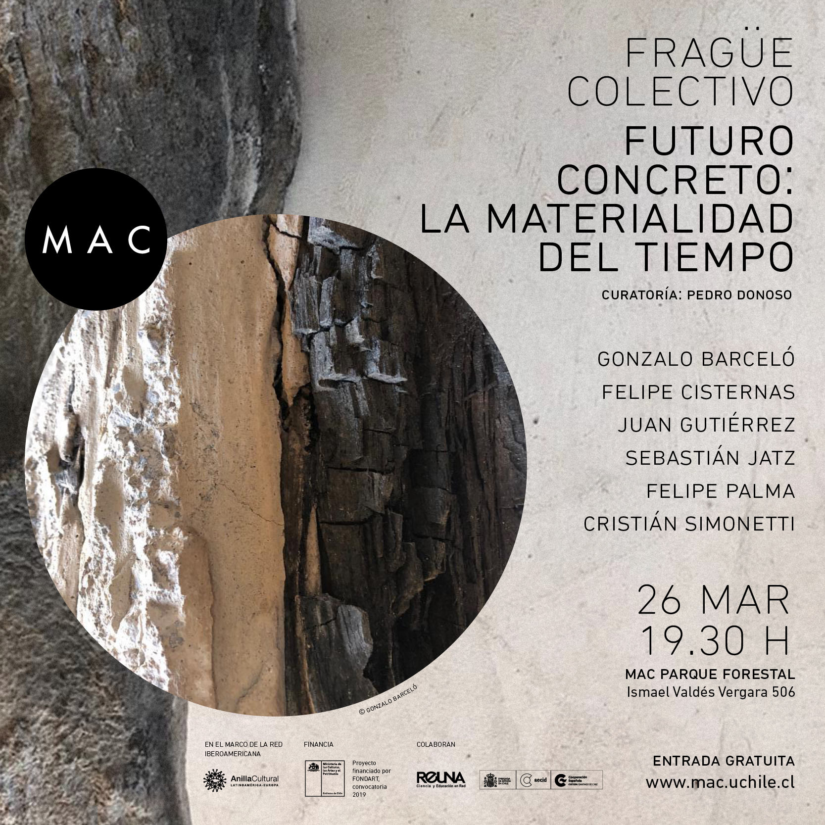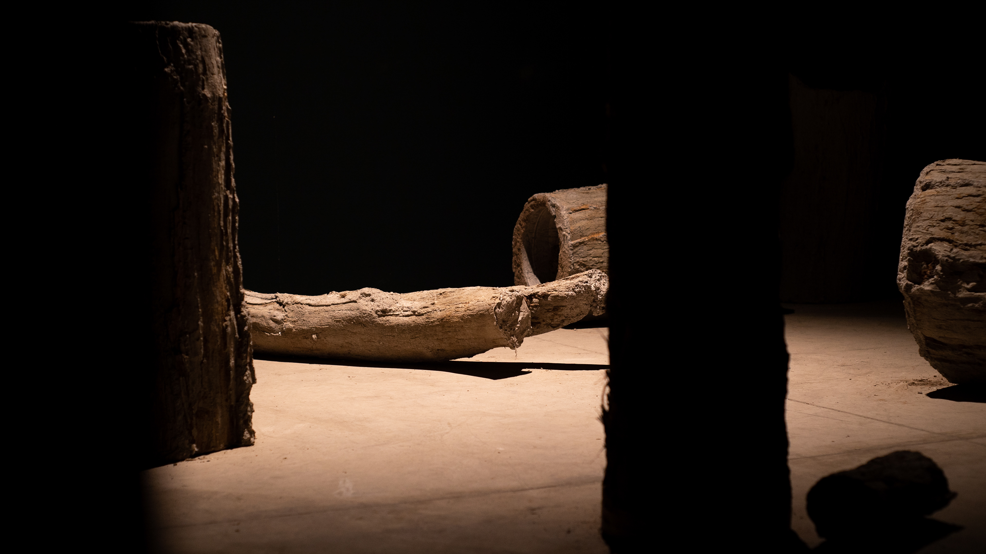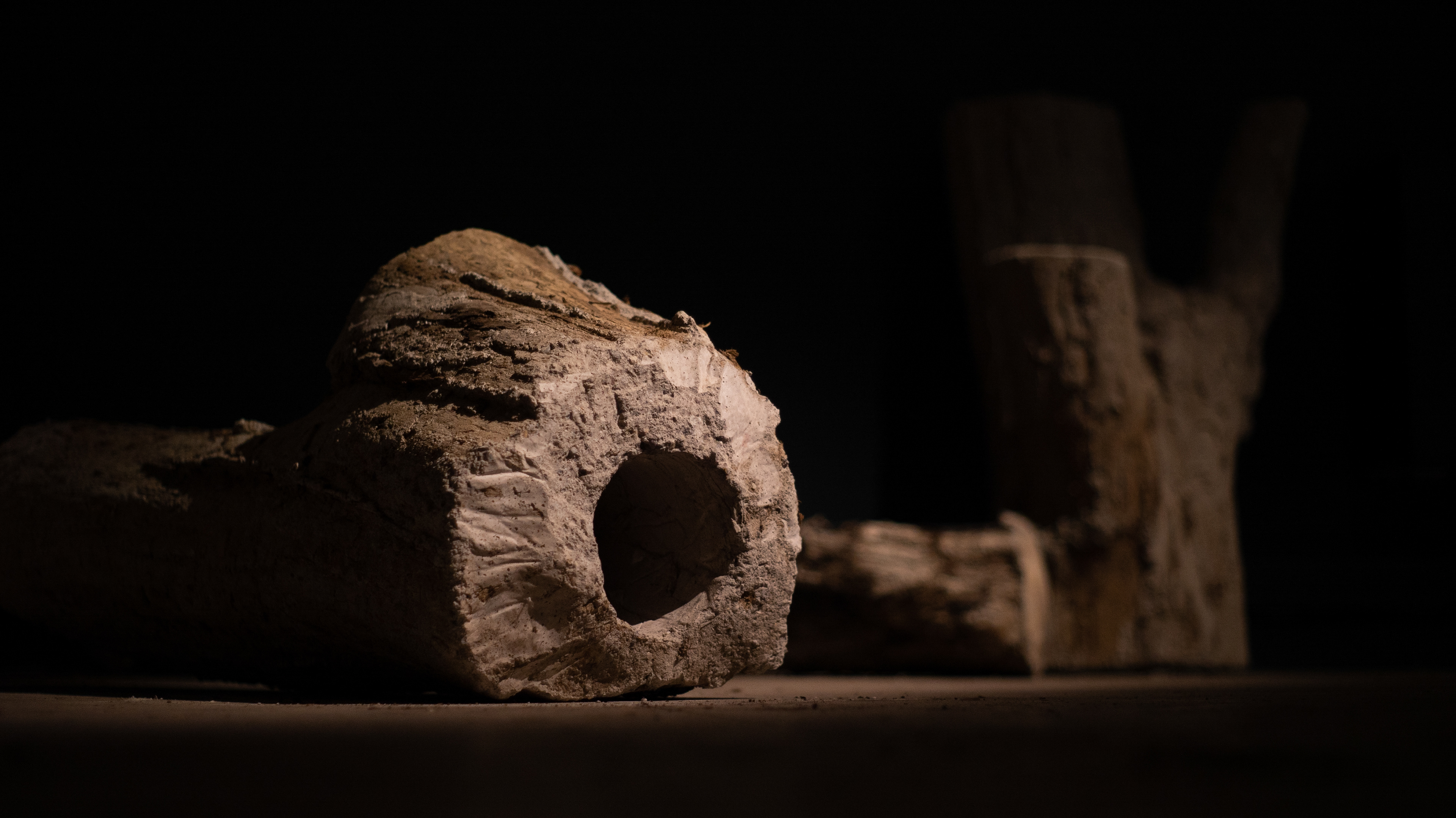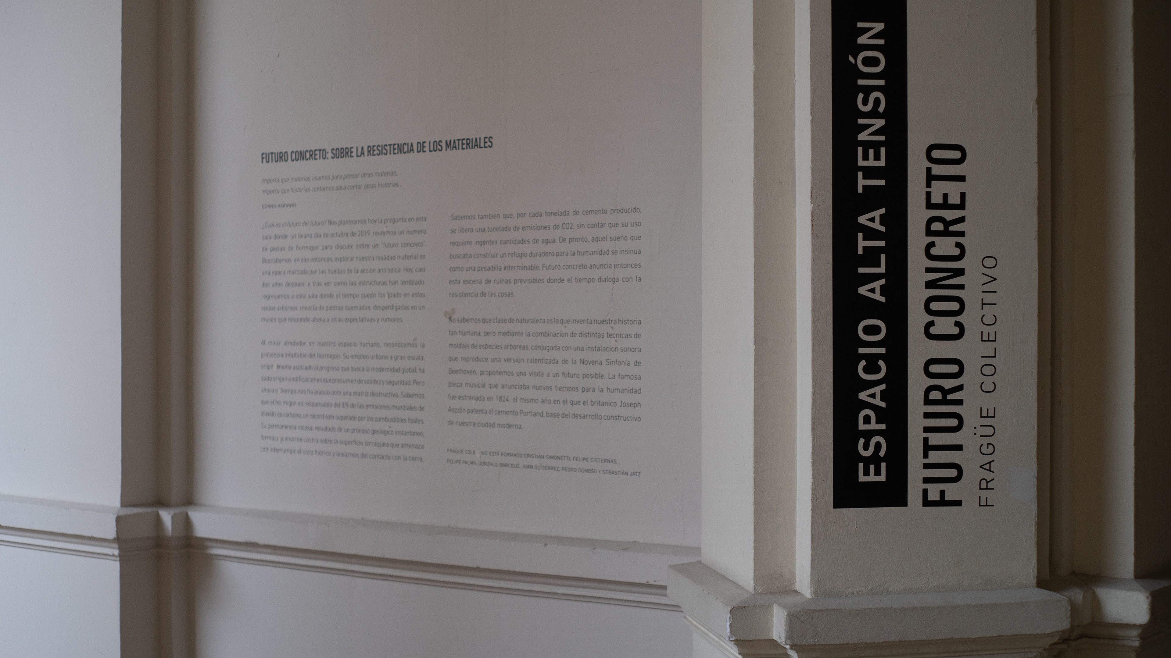 Entre el sueño que buscaba construir un refugio duradero para la humanidad y la pesadilla de un planeta sepultado bajo un material alienante, Futuro Concreto se presenta como una puesta en escena experimental que atiende a la contradicción inherente a los materiales con los que hemos construido nuestro lugar en el mundo. Esta preocupación por nuestra historia material se ve reflejada en una pieza que combina distintas técnicas de moldaje de especies arbóreas conjugada con una instalación sonora que reproduce una versión ralentizada de la Novena Sinfonía de Beethoven. La famosa pieza musical anunciaba nuevos tiempos para la humanidad al ser estrenada en 1824: ese mismo año el británico Joseph Aspdin patenta el cemento Portland, base del desarrollo constructivo de la ciudad moderna.